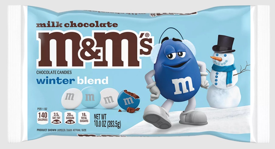 - Mezcla de invierno M&M'S: caramelos de chocolate con leche vestidos de blanco helado y azul ventisca para una atmósfera festiva de paraíso invernal en tazones de dulces y delicias horneadas.